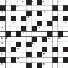 EASY ACROSS 1 Detection system (5) 6 Blaspheme (5) 9 Gold in mass (7) 10 Tempest (5) 11 Devout (5) 12 Custom (5) 13 Lose hope (7) 15 Vehicle (3) 17 Leave out (4) 18 Unsuccessful (6) 19 Wound marks (5) 20 Firearm part (6) 22 Renown (4) 24 Haul (3) 25 Alike (7) 26 Provincial (5) 27 Herb (5) 28 Star sign (5) 29 Harms (7) 30 Male voice (5) 31 Express gratitude to (5) DOWN 2 National song (6) 3 Sudden (6) 4 Spirit (3) 5 Transparent (5) 6 Abundant (7) 7 Single entity (4) 8 Yelp (6) 12 Snag (5) 13 Uncertainty (5) 14 Tendon (5) 15 Essential (5) 16 Not ever (5) 18 Weak (5) 19 Academic (7) 21 Spin (6) 22 End (6) 23 Border (6) 25 Devil (5) 26 Public pool (4) 28 Animal doctor (3)