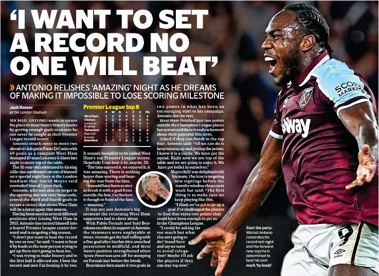 MICHAIL ANTONIO wants to secure his place in West Ham’s history books by getting enough goals to ensure he can never be caught as their Premier League record scorer. Antonio struck twice to move two ahead of club great Paolo Di Canio with 49 goals as a rampant West Ham thumped 10-man Leicester 4-1 here last night to move top of the table. The 31-year-old celebrated by kissing a life-size cardboard cut-out of himself on a special night here at the London Stadium that David Moyes said reminded him of Upton Park. Antonio, who was also on target in the opening-day win over Newcastle, scored the third and fourth goals to secure a victory that shows West Ham will be a force again this season. Having been used in several different positions after joining West Ham in 2015, Antonio has turned himself into a feared Premier League centre-forward and is targeting a big season. “I don’t just want to beat the record by one or two,” he said. “I want to beat it by loads so the next person trying to get up there isn’t going to beat me. “I was trying to make history and in the first half it affected me. I beat the record and now I’m beating it by two. It sounds beautiful to be called West Ham’s top Premier League scorer. Hopefully I can beat it by, maybe, 20. “The fans enjoyed it, we enjoyed it, it was amazing. There is nothing better than scoring and hearing the roar from the fans. “It would have been so nice to break it with a goal from outside the box. I’ve broken it though in front of the fans — amazing.” It was not just Antonio’s big moment the returning West Ham supporters had to cheer about. With Pablo Fornals and Said Benrahma excellent in support of Antonio, the Hammers were unplayable at times. Fornals got the ball rolling with a fine goal after Declan Rice snatched possession in midfield, and West Ham’s position strengthened when Ayoze Perez was sent-off for stamping on Fornals just before the break. Benrahma then made it two goals in two games in what has been an encouraging start to his campaign. Antonio did the rest. West Ham finished just two points outside the Champions League places last season and there is real excitement about their potential this term. Asked if they can finish in the top four, Antonio said: “All we can do is keep turning up and getting the points, I know it is a cliche. We have got the squad. Right now we are top of the table and we are going to enjoy it. We have got belief in ourselves.” Moyes (left) was delighted with his team. The Scot is targeting new signings before the transfer window closes next week but said: “The first thing is to make sure we keep playing like this. “I think we’ve got to go up a gear. I’ve challenged the players to find that extra two points that could have been enough to get us in the Champions League. “I could be asking far too much but what else am I going to do? Stand here and say we want to avoid relegation? Maybe I’ll ask the players if they can stay top now.”